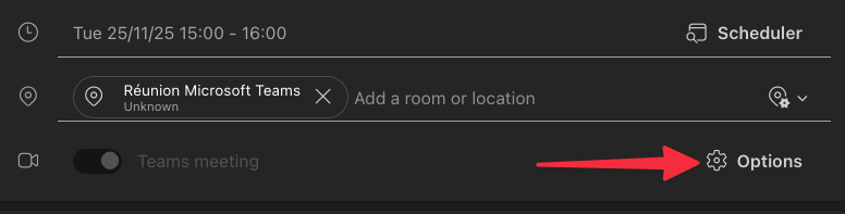 - Après avoir créé une réunion Teams, accédez aux options : depuis le calendrier Teams, double-cliquez sur votre réunion et cliquez sur le bouton Options