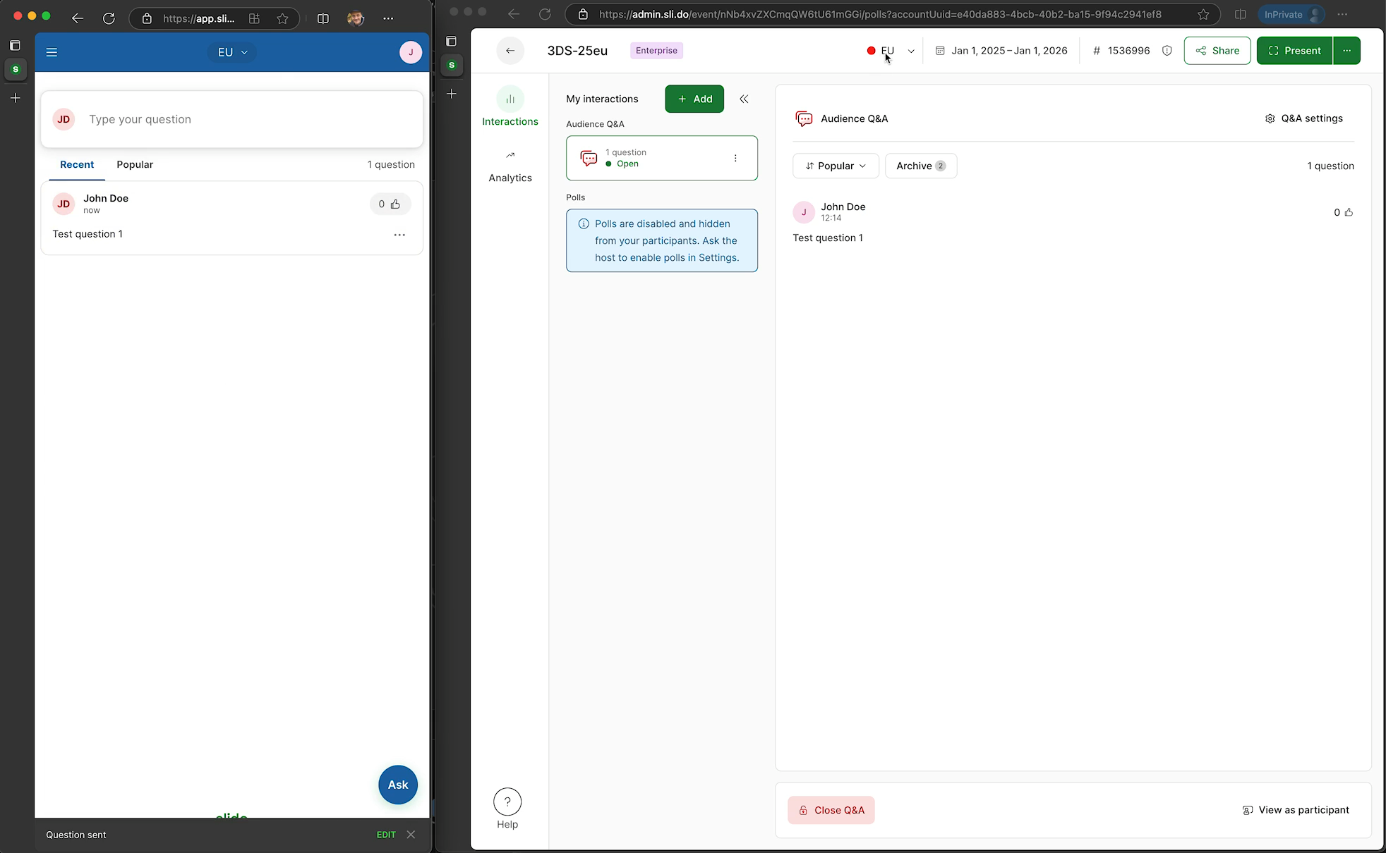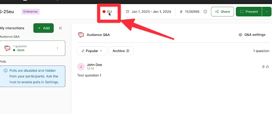 • Slido allows you to manage multiple rooms (e.g., different regions, departments, or topics).